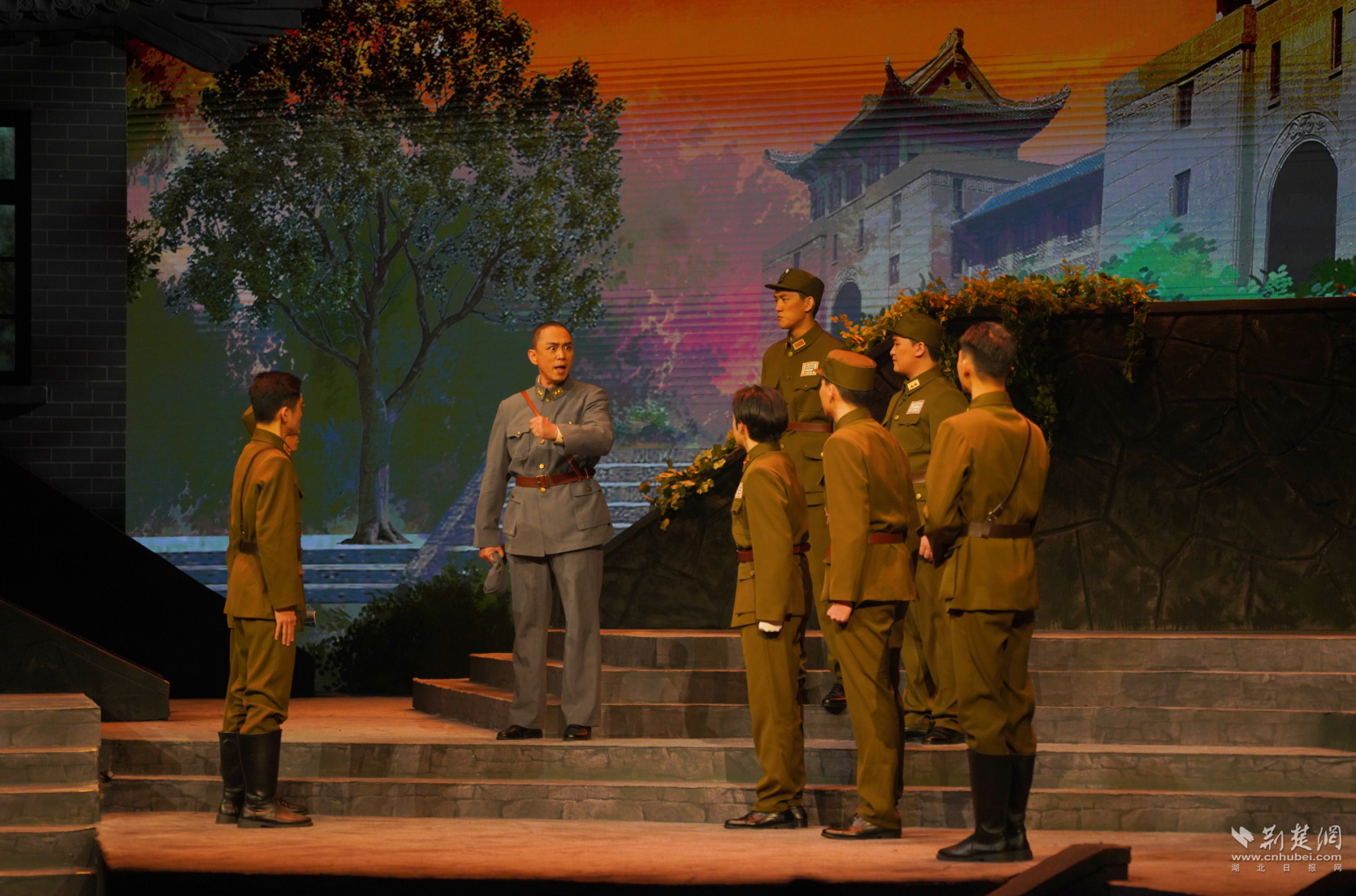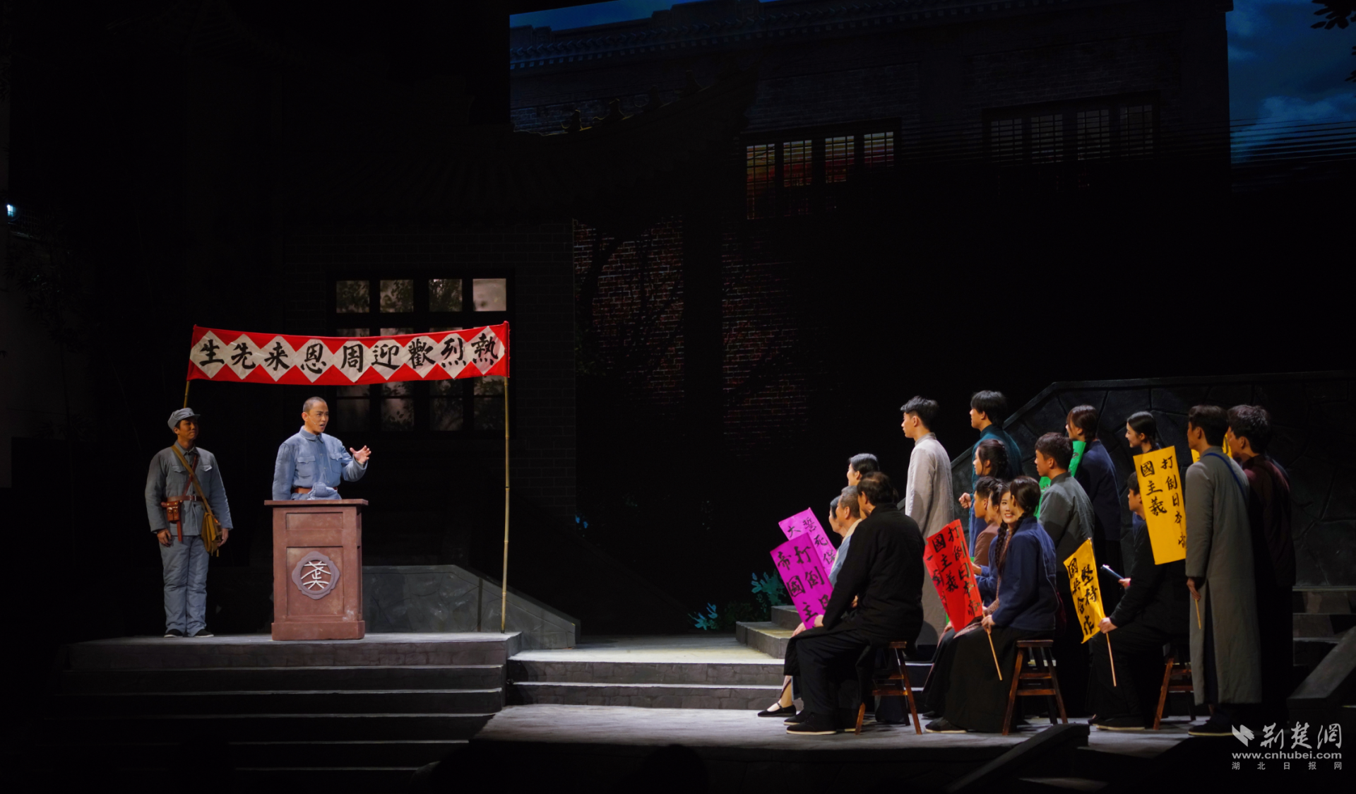 这是武汉大学原创话剧《周恩来在珞珈山》的展演现场。由武汉大学党委宣传部、档案馆(校史馆)共同策划,艺术学院(艺术教育中心)承担创作排演任务的这部话剧,以1937年至1938年全面抗战初期的烽火岁月为背景,再现了周恩来同志在珞珈山“十八栋”寓居期间,广泛团结师生、推动抗日救亡的感人历程。